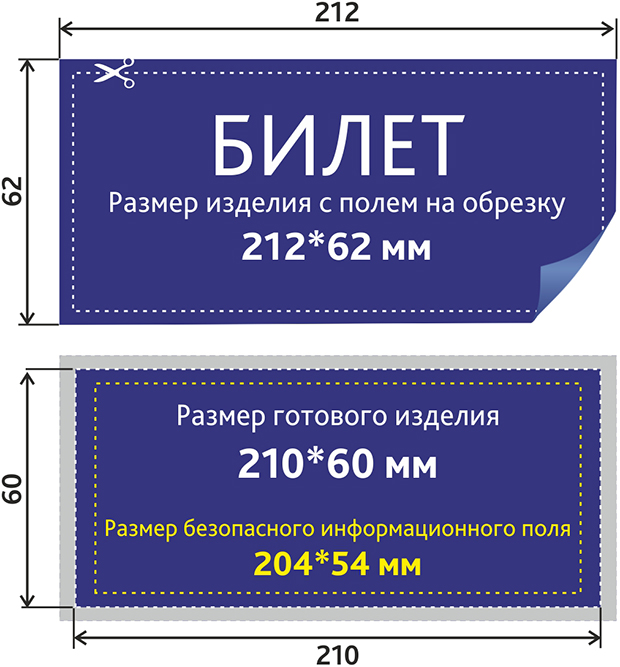 Размер билета с припусками на обрез 212x62 мм (т.е. по 1 мм с каждого края);