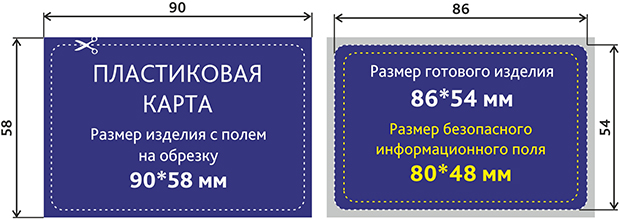Размер пластиковой карты с припусками на обрез 90x58 мм (т.е. по 2 мм с каждого края);