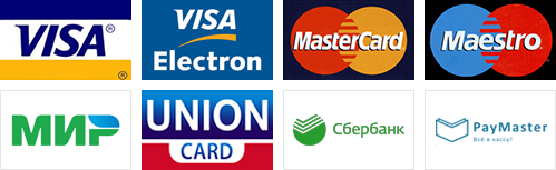 Visa, Electron, MasterCard, Maestro, Мир, Union card.