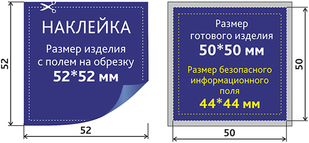 Размер самоклеящейся листовки с припусками на обрез 52x52 мм (т.е. по 1 мм с каждого края);